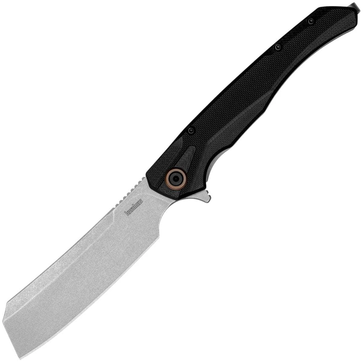 A large cleaver blade meets slim, modern design with the Strata – Cleaver. This kitchen-inspired 4-inch blade is great for slicing and chopping. D2 tool steel takes a sharp edge for repeated use. Despite its size, the balanced folder opens smoothly with KVT ball bearings. Grip the Strata – Cleaver with confidence using its G10 front handle and carry it on-the-go with an extra-deep-carry pocket clip. Completing the package are the eye-catching bronze PVD tube spacers and a pivot collar.